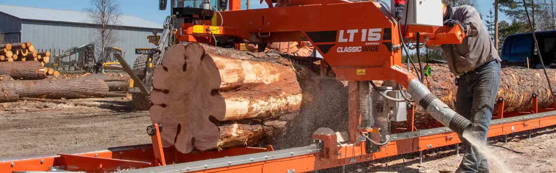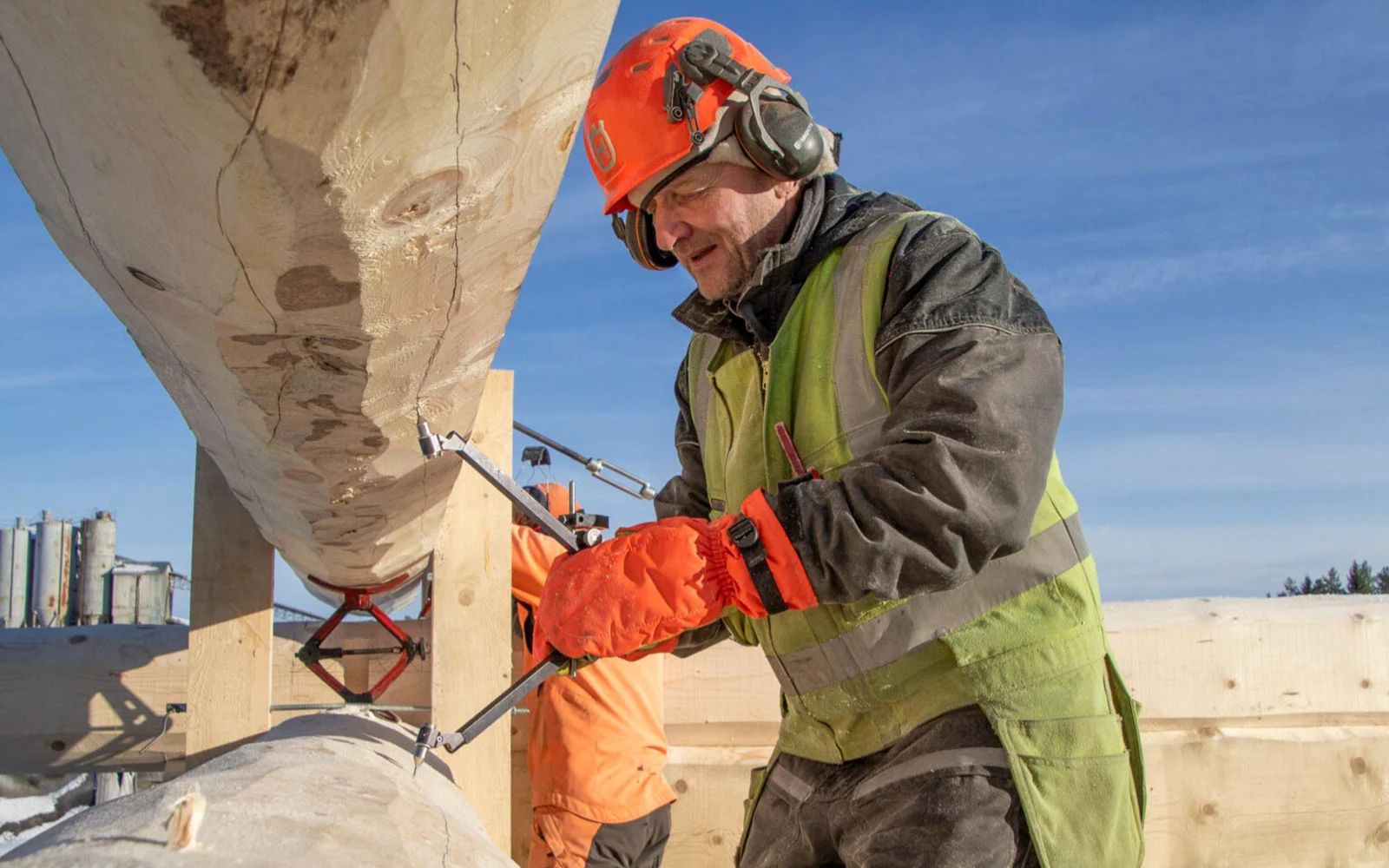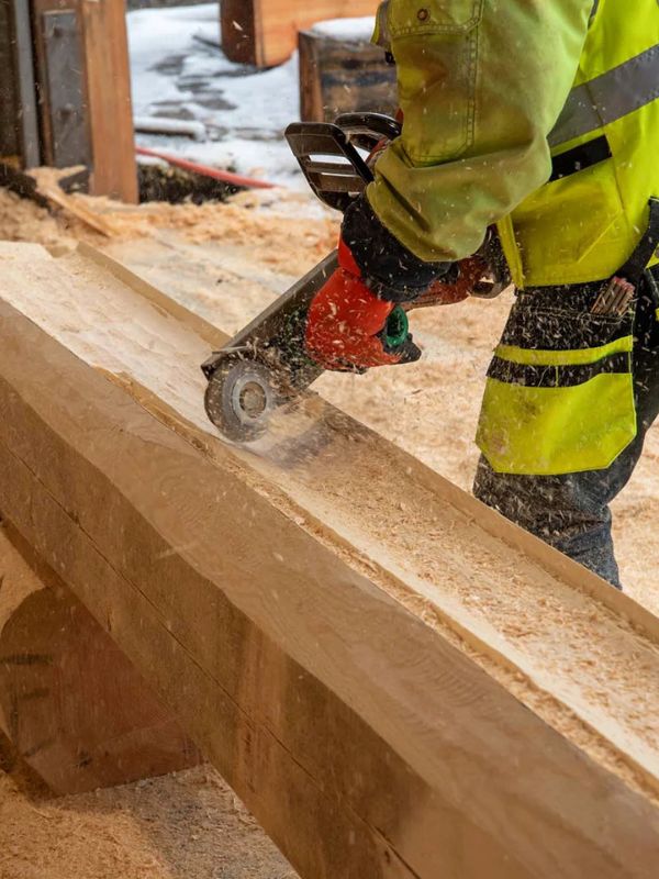 Large Nordic trees are sawn into strong construction lumber and structural wooden elements. Depending on the natural characteristics of each tree, the timber is selected and processed for different structural uses such as load-bearing frames, exterior wall structures, or interior ceiling supports.