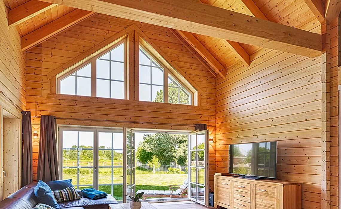 Because of this structural stability, the system allows significantly greater architectural freedom. Large window openings, modern detailing, and complex building forms can be integrated without the settlement considerations typically associated with massive log construction.
